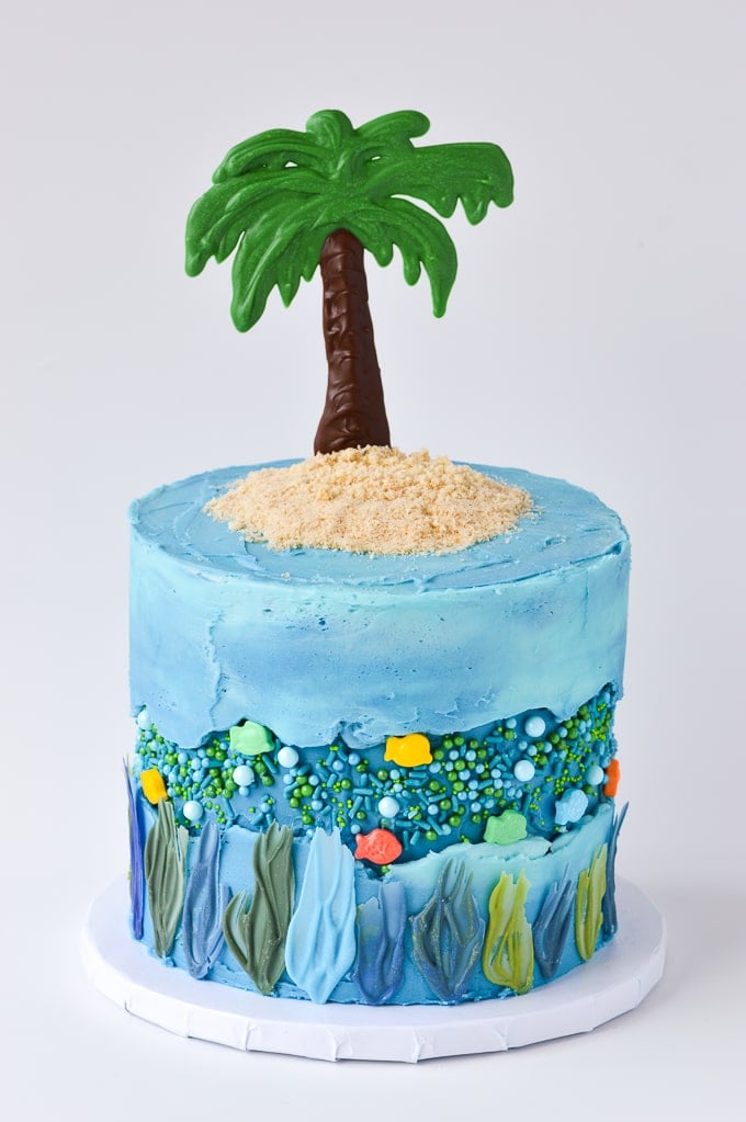 The seaweed at the bottom is made from melted chocolate as is the palm tree. And, the wood technique can be found in detail in this fall-themed fault line cake.